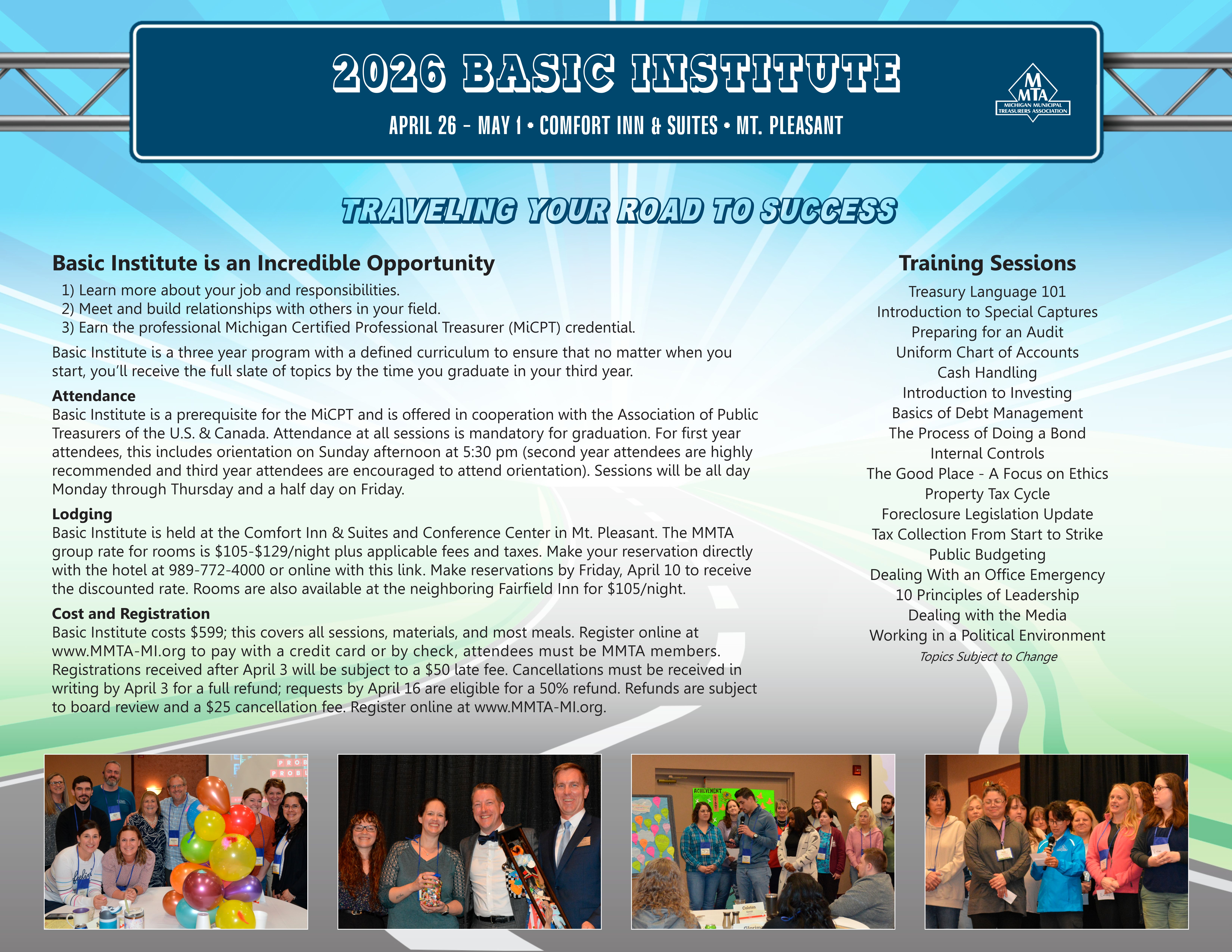 Attendance Since the Basic Institute program leads to the MiCPT (Michigan Certified Professional Treasurer) certification, attendance for all sessions is mandatory. If you are unable to attend a session due to an emergency, you must contact the program facilitator or MMTA staff as soon as you can to discuss your attendance. Attendance is only in-person; there is no livestreaming option. The MMTA Board of Directors has committed to having both Basic and Advanced Institute as an in-person conference to ensure learning from both presenters and through networking with other attendees.