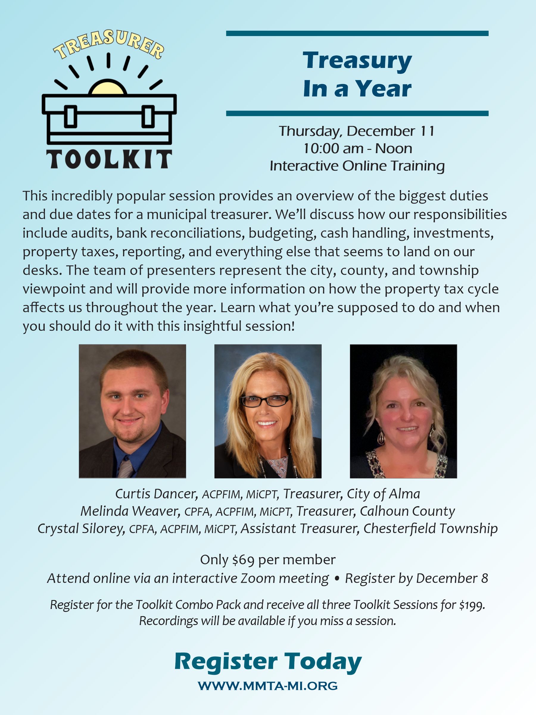 Treasurer Toolkit - Treasury in a Year This interactive webinar session gives you the inside scoop from experienced treasurers who have "been there and done that" and want to share their knowledge and experiences with you! This session provides an overview of the biggest duties and due dates for municipal treasurers. Registration is $69 for this session, you will receive your Zoom meeting link prior to the training. The session is worth one point of continuing education credit. Register for the December 11 Treasury in a Year Treasurer Toolkit single session here. Save time and register for the Treasurer Toolkit Combo for $199 to receive ALL THREE 2025 Treasurer Toolkit sessions. Click to learn more about the Toolkit lineup. If you register for the Combo you do NOT have to register for the individual sessions. Register for the Combo here. The first two Toolkit Sessions (the Basics of Bank Reconciliation and Introduction to Budgeting) have already taken place and are available as recordings if you register for the Toolkit Combo. Note: if you are a MMTA member and would like to register additional attendees from your municipality who are not current MMTA members, select "register a guest" on the online registration form to add your coworkers. The non-member rate for Toolkit sessions is $99 per attendee or $297 for the Toolkit Combo, which includes all three 2025 sessions. |