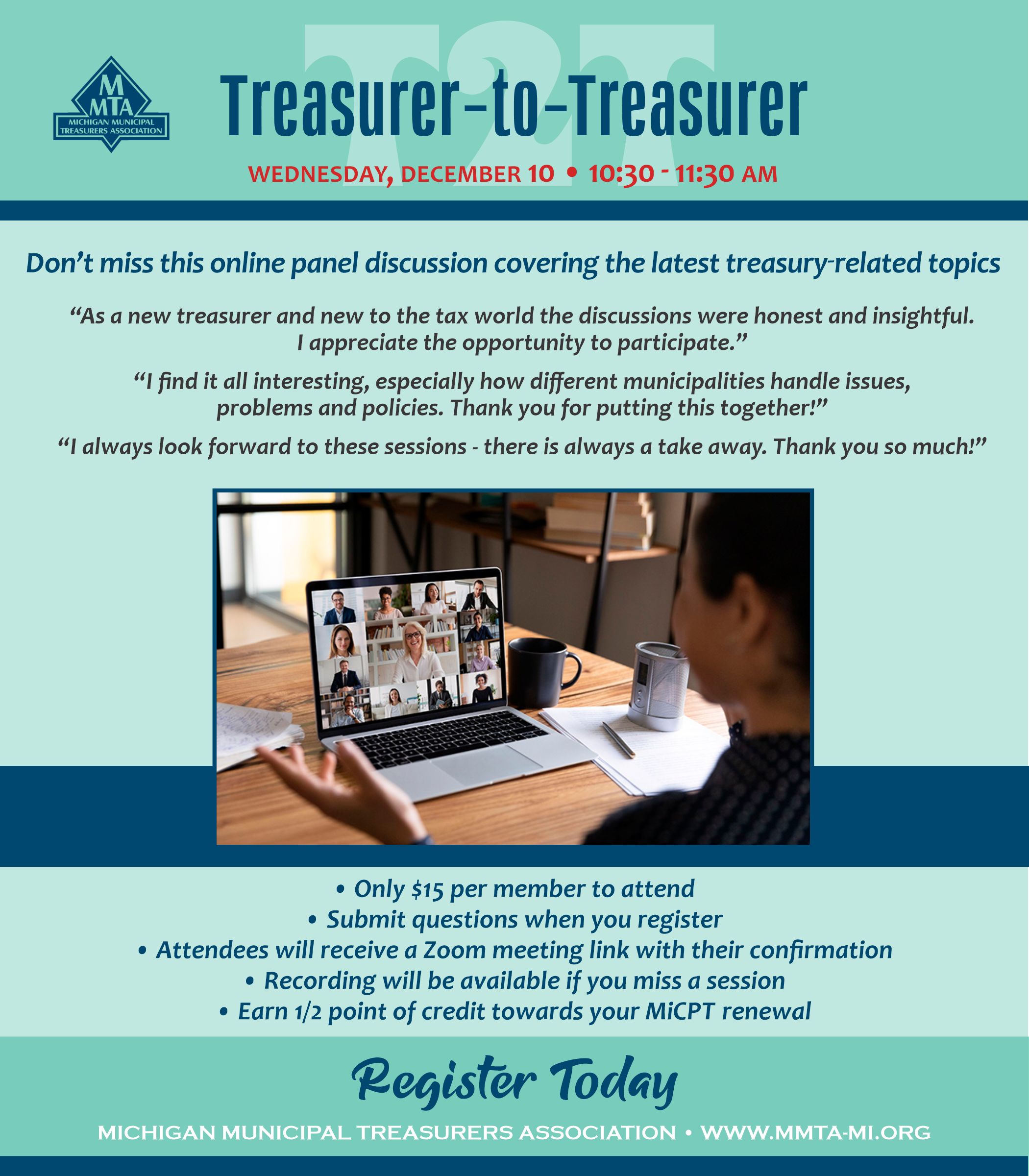 Join Us For A Virtual Treasurer-to-Treasurer Session Hear everyone's questions on the most topical issues of the day. Our panelists will discuss and answer your questions and keep you updated on a wide range of topics that affect treasury departments at Michigan municipalities. These lively discussions provide information from monthly panelists but also allow attendees to chime in via the chat or by asking follow-up questions and even sharing their own experiences and solutions. You can also earn half a point of continuing education credit towards your MiCPT re-certification (or your CPFA), just make sure to stay for the entire session. Registration is only $15 per session. If you registered for the 2025 T2T Bundle you do NOT have to register for this individual session. Register Now for the single December 10 Treasurer-to-Treasurer session. |